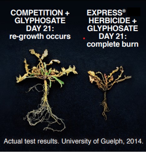 Express® Herbicide with TotalSol® Granules is now labeled for a 1-day plant-back interval to most pulse crops when applied at 0.25 oz/A in a burn-down application. This provides growers with an effective tool for controlling some of the more difficult winter annual and perennial weeds commonly found in our fields. The image below demonstrates control of dandelion.