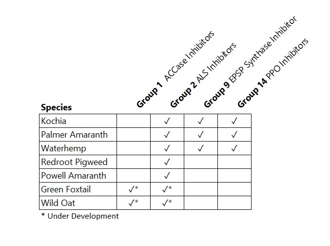 The testing is limited to known DNA changes linked to resistance. At the time of this posting, we test Kochia, Palmer Amaranth, and Waterhemp for DNA markers linked to Group 2, Group 9, and Group 14 herbicide resistances. NAGC can test Redroot Pigweed and Powell Amaranth but only the Group 2 resistance test works on these pigweeds. We are also asking for Green Foxtail and Wild Oat samples and hope to have tests for Group 1 and Group 2 resistances soon.