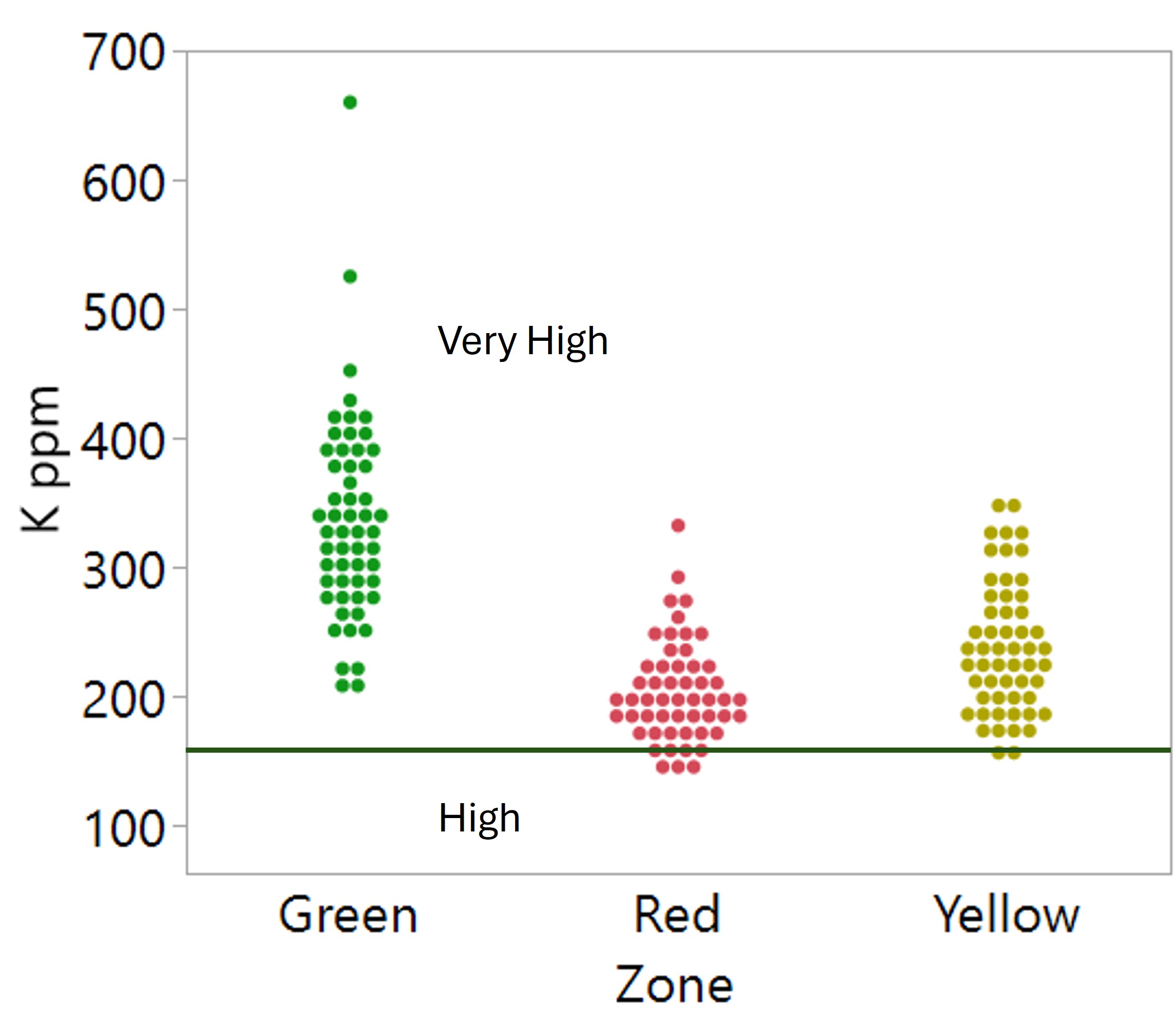 Potassium tended to be higher on average by around 100 ppm in the green zones compared to the yellow and red. Overall, potassium levels were high to very high regardless of zone. On the graph below, the green horizontal line is the threshold dividing the high from very high categories. Each dot on the graph is a zone within a field. Continued monitoring of the yellow and red zones will be important to prevent the development of potassium deficiency over time.
