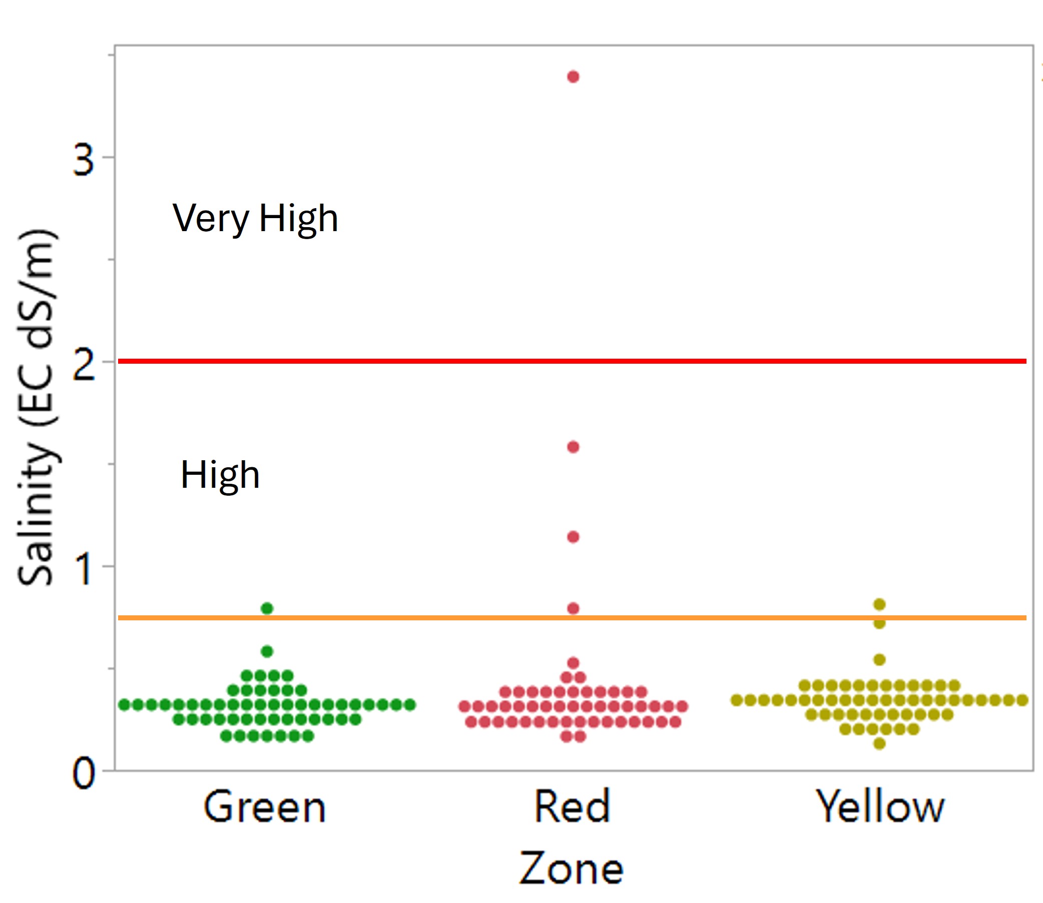 Some zones exhibited high to very high levels of salinity. Most of the time this was associated with a red zone, but not always. These salty areas of the field can be kochia breeding grounds, which then proceed to spread herbicide resistant weeds to the better producing areas of your field and even across the farm. Planting these areas to a perennial salt tolerant grass, or even mowing the smaller patches to prevent kochia seed production might be a better investment of your time and money than planting and fertilizing something that isn’t going to grow.